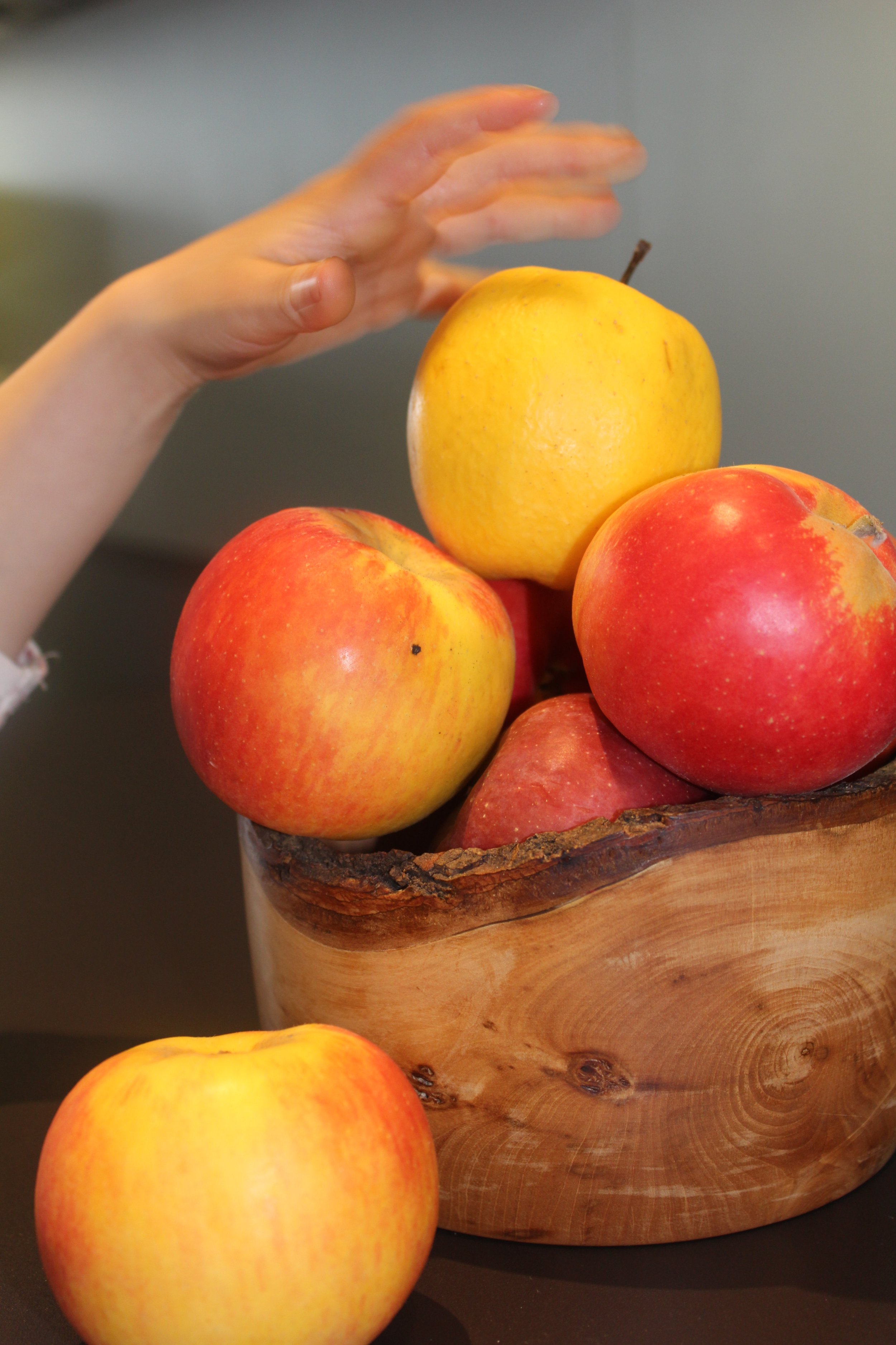 Äpfel der Vorsaison in handgedrechselter Schale.